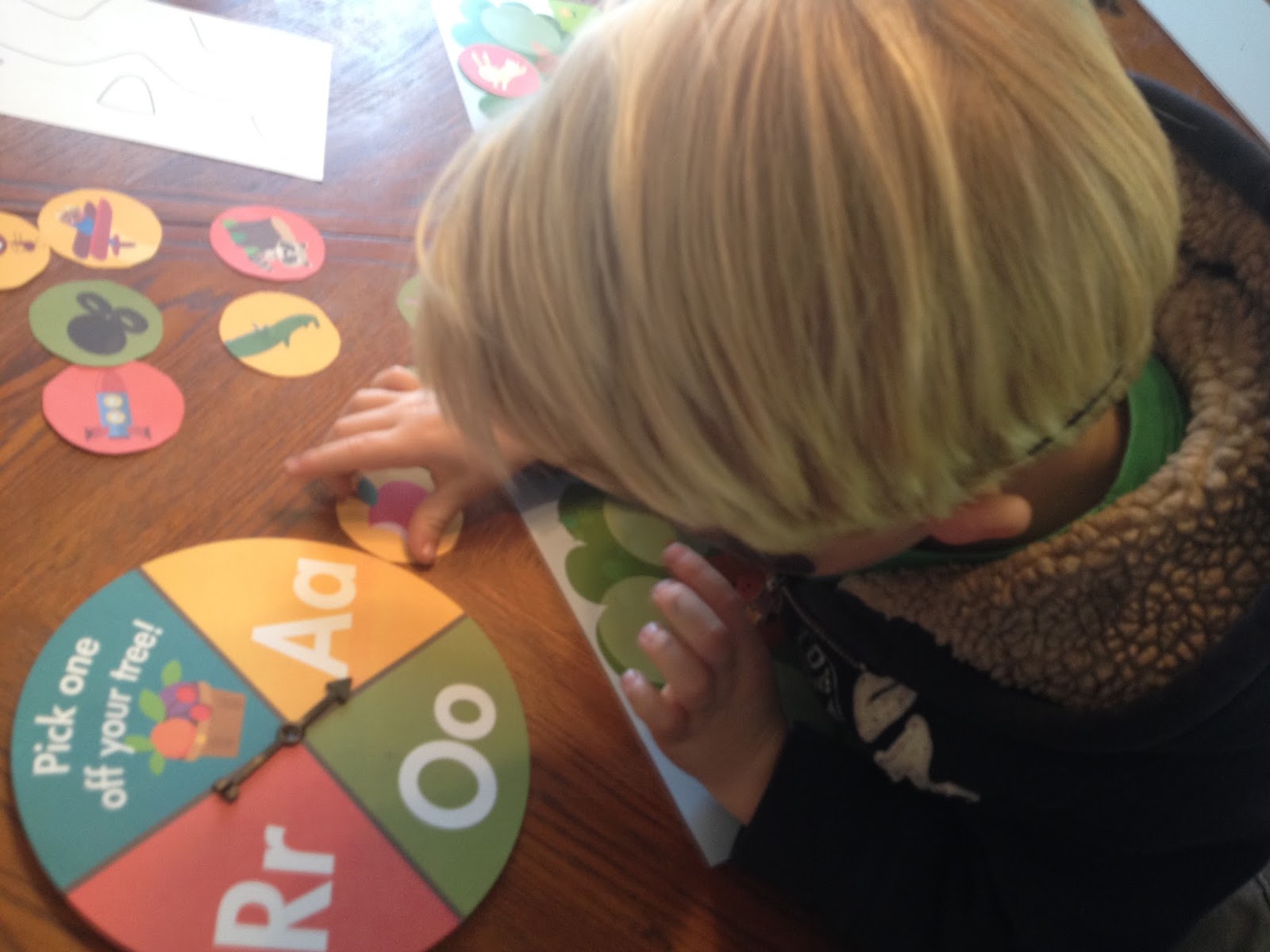 As a parent one thing I'm learning is not to stress when one of my kids does something or, more often, is not doing something yet. Some kids potty train at 1 others at 2 and beyond. Some of my friends claim to have potty trained their kids at 6 months! In resisting the temptation to compare we enjoy our kids and the phase that they are in now. The more I enjoy engaging with them, the faster they catch on and develop. In this way of peaceful teaching, kids grow well.This is no less true with literacy. When I sit down with my 4-year-olds one can write his name, the other can't. One catches on to the concept of words and learns site words quickly the other seems more interested in the pictures and abstract concepts around the book then actually learning how to read a word or what sounds letters makes. It's tempting to not become frustrated. MGT gently guides us into learning and allows me to teach using fun games like this one to introduce the phonetic alphabet.